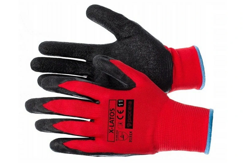 Protiskluzové pracovní rukavice X-LATOS jsou vyrobeny z červeného polyesteru. V oblasti úchopu jsou potaženy černým latexem se zdrsněnou strukturou pro dodatečnou ochranu a lepší uchopení. Okraj rukavic je opatřen lemováním.