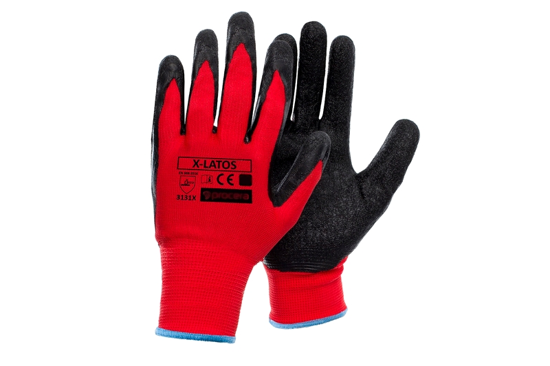 Protiskluzové pracovní rukavice X-LATOS jsou vyrobeny z červeného polyesteru. V oblasti úchopu jsou potaženy černým latexem se zdrsněnou strukturou pro dodatečnou ochranu a lepší uchopení. Okraj rukavic je opatřen lemováním.